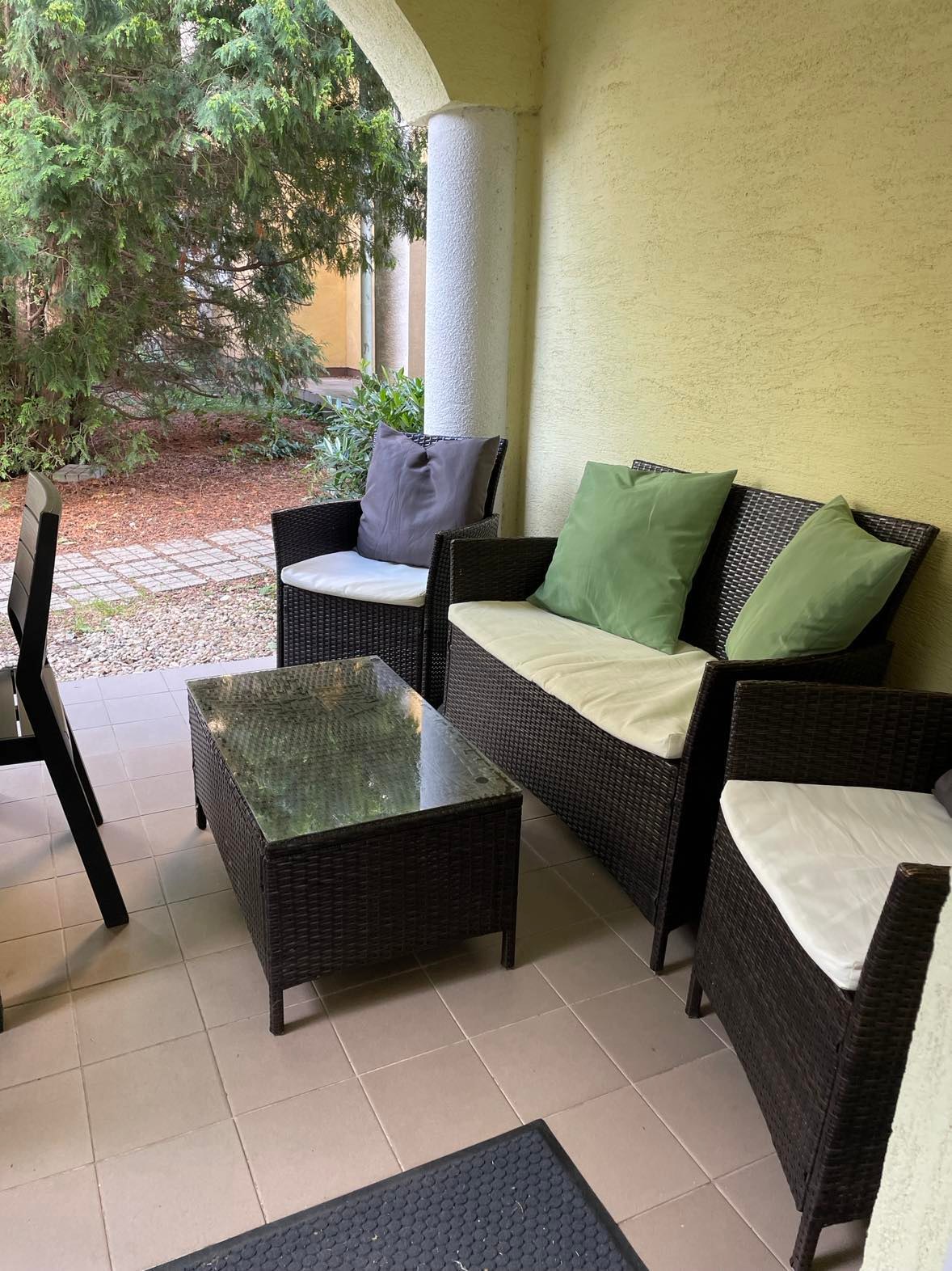 Nyaralónk teraszán 4 szék, 1 étkezőasztal illetve 2 fotel, 1 pad,