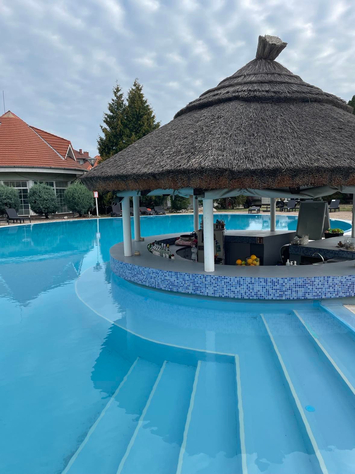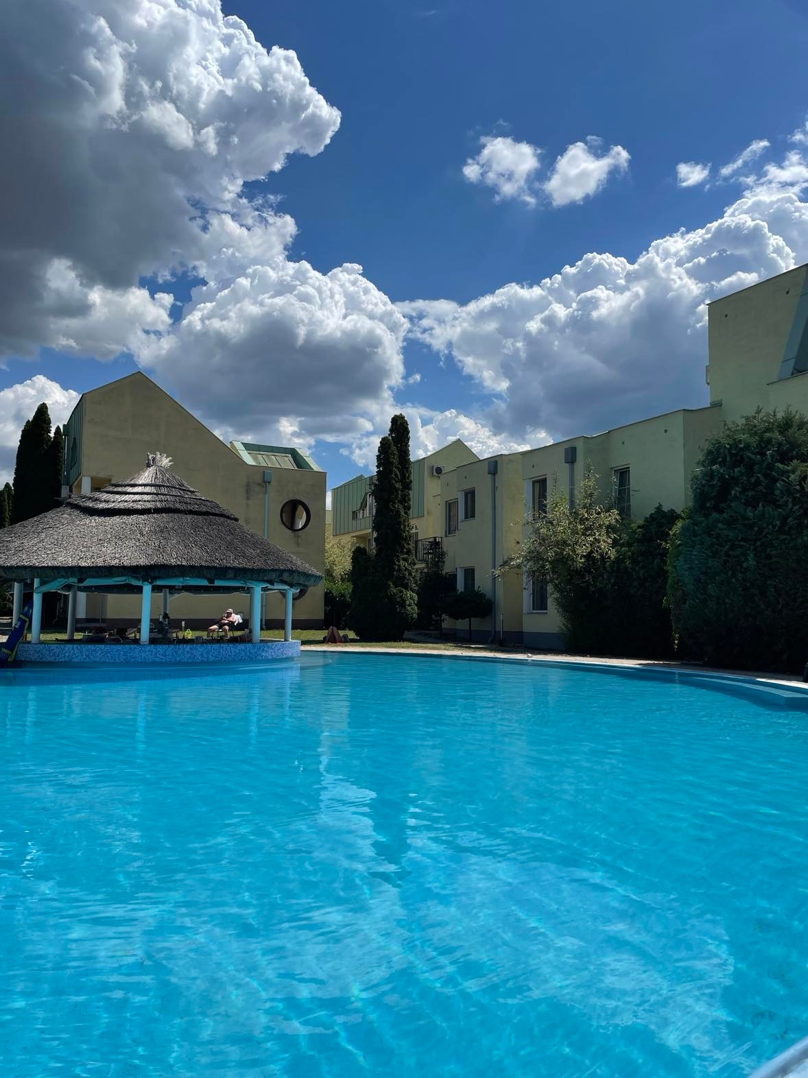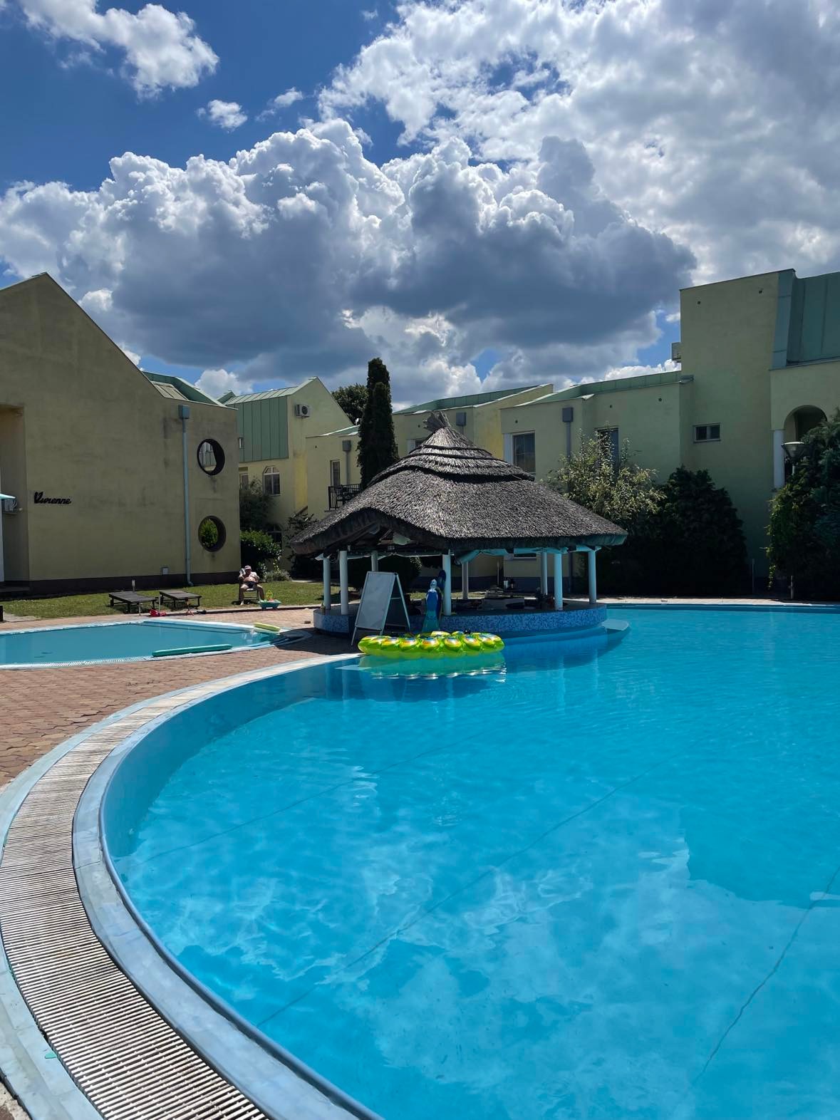 A nyaraló park két impozáns medencével, a kertben gyermekjátszóval, strandröplabda pályával,