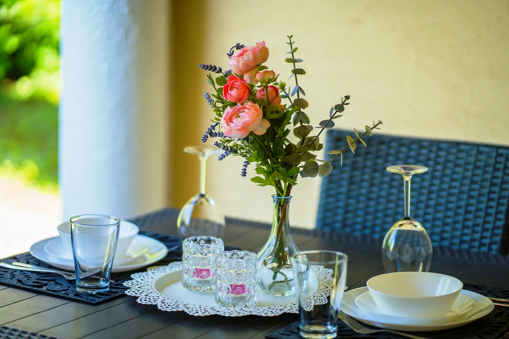 Nyaralónk teraszán 4 szék, 1 asztal található