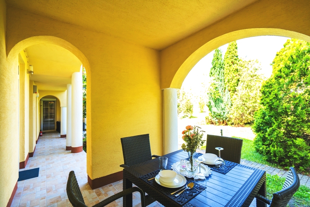 A lakás terasza árnyékos, romantikus kialakítású, kilátással a zöldellő kertre, néhány méterre a