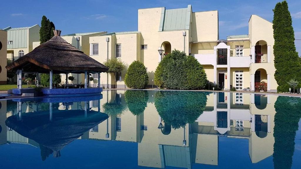 A nyaraló park két impozáns medencével, a kertben gyermekjátszóval, strandröplabda pályával,