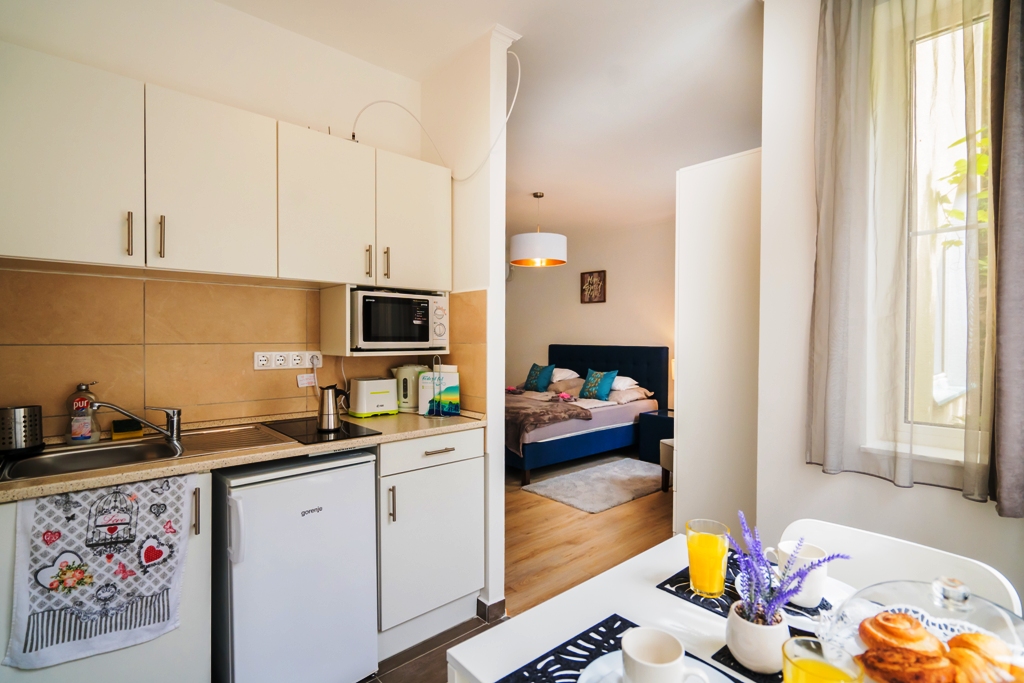A lakásban nagyméretű LED tv-n élvezheted kedvenc Netflix filmjeidet. A konyha mindennel
